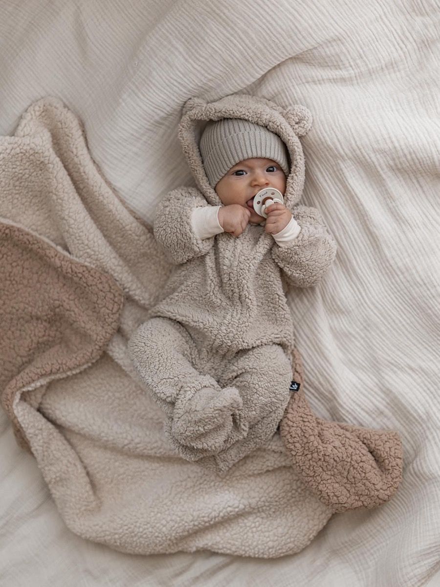 Suloinen nallehaalari vauvalle pitää pikkuisesi lämpimänä kylminä päivinä. Superpehmeä teddy-materiaali, hupun suloiset nallenkorvat ja ajaton hiekan sävy tekevät tästä haalarista talven suosikkivaatteen.