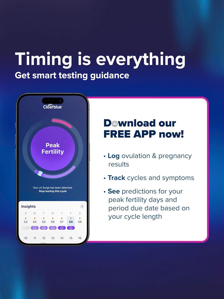 Clearblue tarjoaa maksuttoman Clearblue Period & Cycle Tracker -sovelluksen, jonka avulla voit seurata kuukautiskiertoasi ja kirjata ovulaatiotestien tuloksia helposti yhteen paikkaan. Sovellus auttaa ennustamaan hedelmälliset päivät ja kuukautisten alkamisen sekä antaa selkeän yleiskuvan omasta kierrostasi. Yhdessä Clearblue Digital Ovulaatiotestin kanssa sovellus tekee raskauden suunnittelusta entistä järjestelmällisempää ja helpompaa.Pakkaus sisältää: Digitaalisen testilaitteen ja 30 kpl testipuikkoja