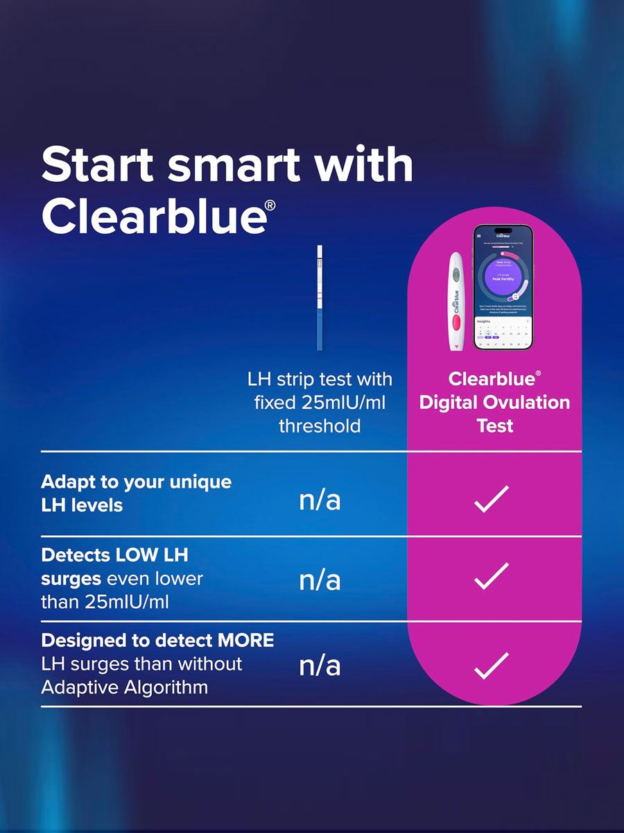 Toisin kuin perinteiset viivatestit, Clearblue Digital antaa yksiselitteisen tuloksen digitaalisella näytöllä. Näet selvästi, milloin LH-hormoni on noussut ja milloin olet hedelmällisimmilläsi.Tämä poistaa epävarmuuden ja tekee testauksesta stressittömämpää ja varmempaa.