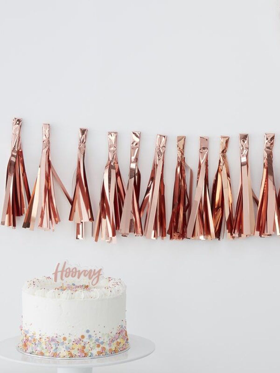 Ginger Ray ruusukultainen tupsu nauha luo upean yksityiskohdan juhliisi. Tyylikäs sisustus, joka näyttää upealta kaikissa juhlissa. Ripusta tassel nauha tapahtumapaikan ympärille lisätäksesi glamouria ja hohtoa! Ruusukultainen koriste näyttää upealta seinillä, oviaukkoissa ja huonekaluissa. Tupsut on helppo koota ja muodostaa kaunis nauha. Muista pöyhistää tupsut!