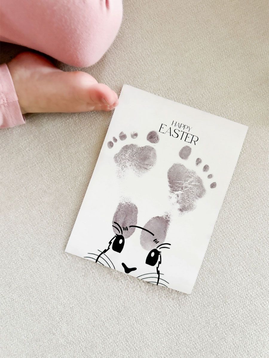 - Happy Easter (pupu-aiheinen kortti – lapsen jalanjäljet pupun korvina)