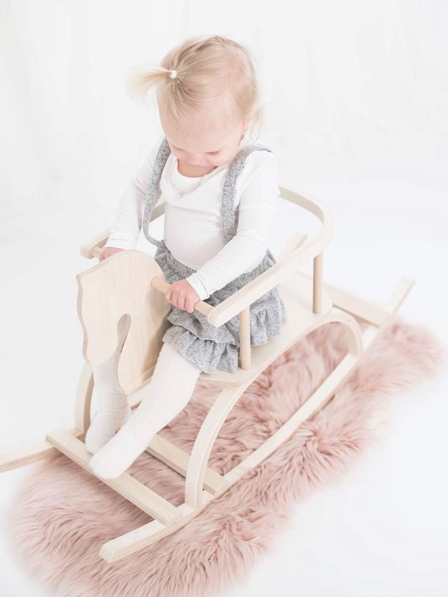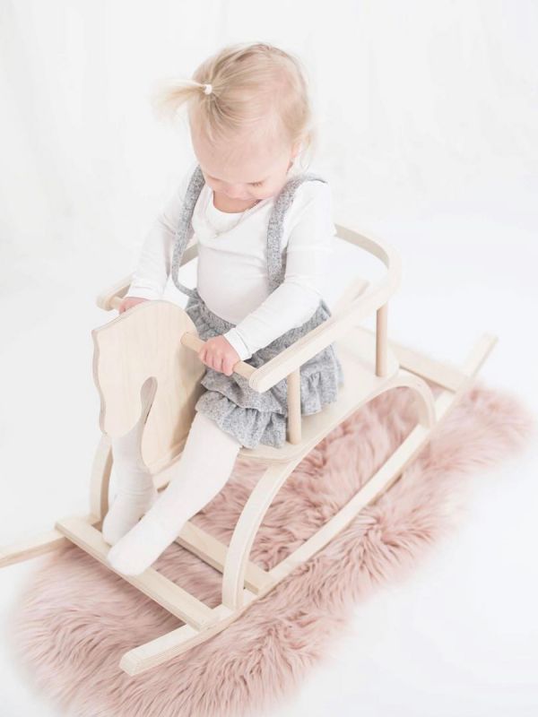 Käsintehty kaunis vaaleasävyinen keinuhevonen, jossa turvakaari, sopii kotona niin lastenhuoneeseen kuin olohuoneeseenkin. Turvakaarensa ansiosta pienikin keinuja pysyy hyvin keinuhevosen vauhdikkaassa kyydissä.