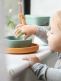 Kata pöytä Done By Deer upealla silikonisella lapsen Stick&Stay ruokailusetillä. Sinapin värinen lautanen, vihreä kulho ja hiekan sävyinen muki on koristeltu kohokuvioilla ja pienen on helppo ottaa niistä kiinni. Imukuppi lautasten pohjassa takaa ettei lautaset lähde lentoon kesken ruokailun.