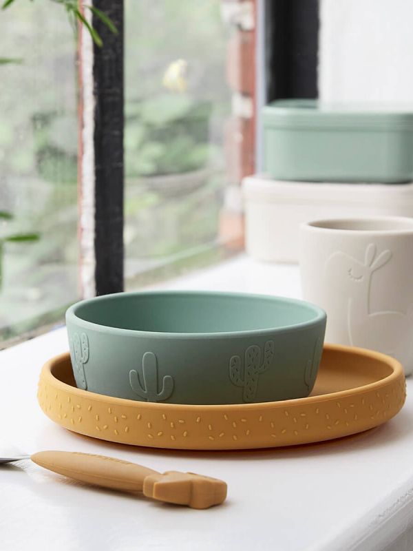 Kata upea pöytä Done By Deer silikonisella lapsen Stick&Stay ruokailusetillä. Sinapin värinen lautanen, vihreä kulho ja hiekan sävyinen muki on koristeltu kohokuvioilla, joissa esiintyy ihanat Lalee-, Birdee-, juhlakonfetti ja kaktus hahmot. Paina lautanen ja kulho tiukasti alas, ja ne tarttuvat useimpiin sileisiin pintoihin luonnollisella imullaan. Tämä estää pieniä lapsia työntämästä, kaatamasta tai heittämästä niitä ympäriinsä.