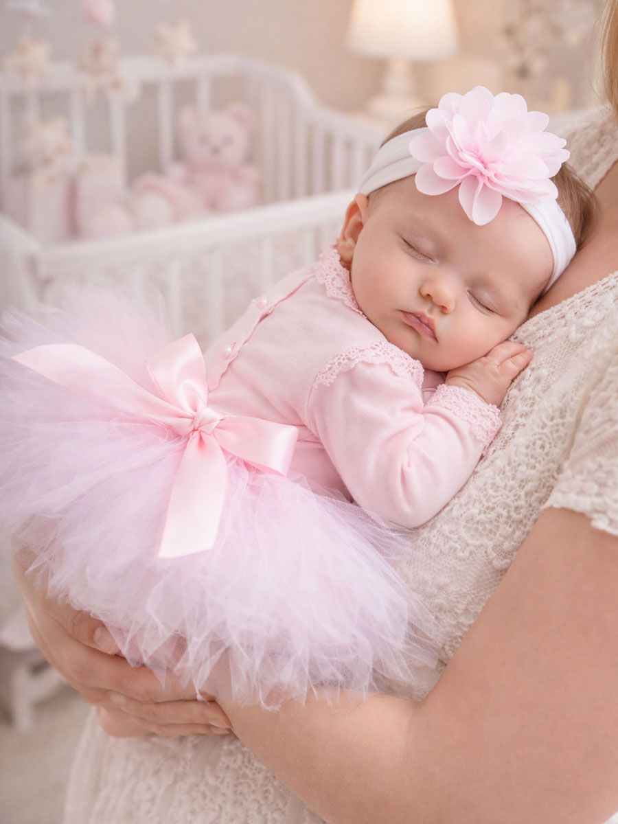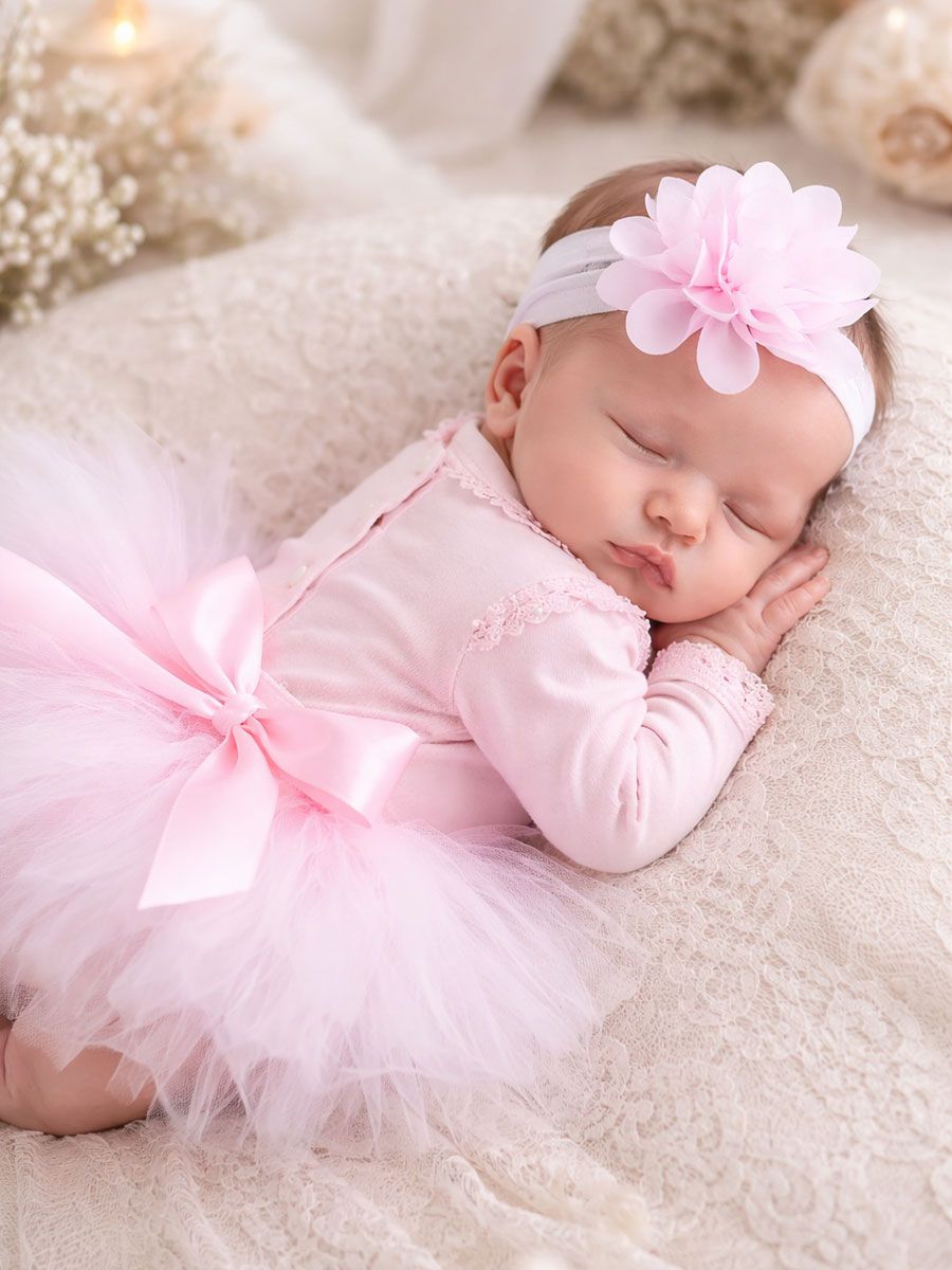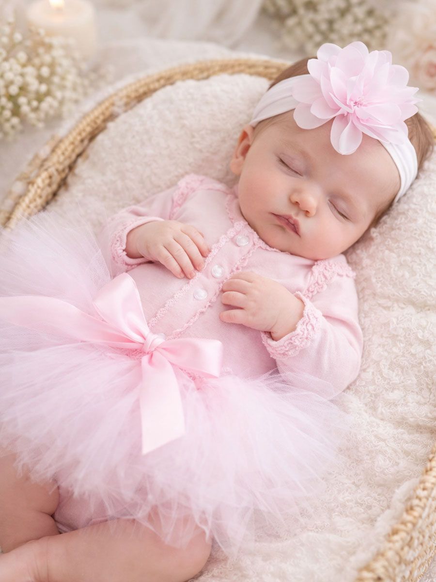 Hento, pehmeä ja täydellisen suloinen vauvan juhla-asu tärkeisiin hetkiin. Vaaleanpunainen tutu mekko ja kukkapanta luovat unohtumattoman ilmeen ristiäisiin, kuvauksiin ja arjen pieniin juhliin.