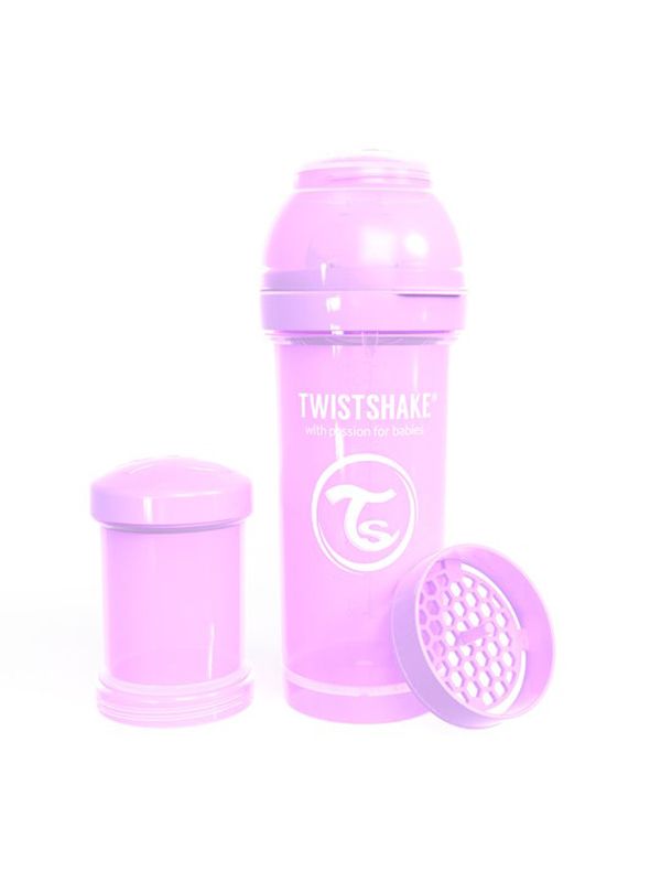 TwistShake tuttipullo. TwistShake tuttipullo pakkaus sisältää lisäksi hyödyllisen säilytyspurkin jossa voi kuljettaa esimerkiksi maitojauhetta, maissinaksuja tai tutteja. TwistShake on suunniteltu ehkäisemään koliikkia ja takaa tasaisen nesteen virtauksen. Leveä muoto helpottaa pullon puhdistamista.